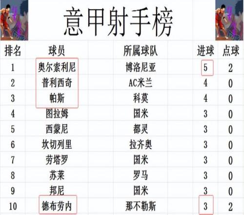 射手榜方面,奥尔索里尼昨晚打入一球后,超过普利西奇1球独居榜首,帕斯和普利西奇4球并列第2。莱奥破荒梅开二度,但还差1球才能挤入前十。图拉姆,劳塔罗,西蒙尼和德布劳内等人3球并列第4。