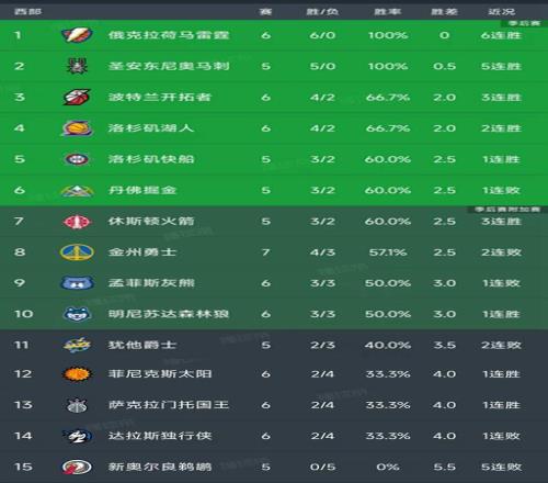 灰熊和森林狼的战绩都是3胜3负暂列第9和第10,莫兰特上一场对教练组不满,赛后被球队禁赛一场,明天对阵猛龙的比赛无法登场。森林狼今天以122-105轻取黄蜂。爵士以2胜3负暂列第11名。太阳、国王和独行侠都是2胜4负,国王今天135-133战胜雄鹿迎来赛季第二场胜利,独行侠今天110-122不敌活塞,拉塞尔空砍了31分7篮板。鹈鹕依然是最差的球队,难求一胜,0胜5负垫底!