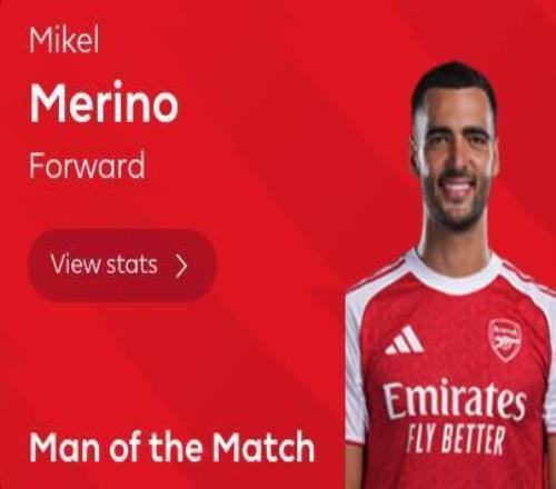 英超第14轮,阿森纳主场2-0击败布伦特福德,此役传射建功的梅里诺当选英超官方全场最佳球员。