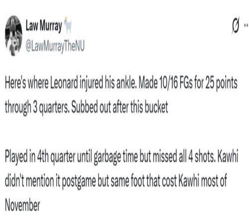 据快船队记Law Murray报道,小卡的脚踝受伤发生在昨日对阵尼克斯比赛的第三节中段,莱昂纳德在一次投篮后踩到了一位坐在场边的球迷的脚,他在前三节16投10中,拿下25分,在这次得分后就被换下场。